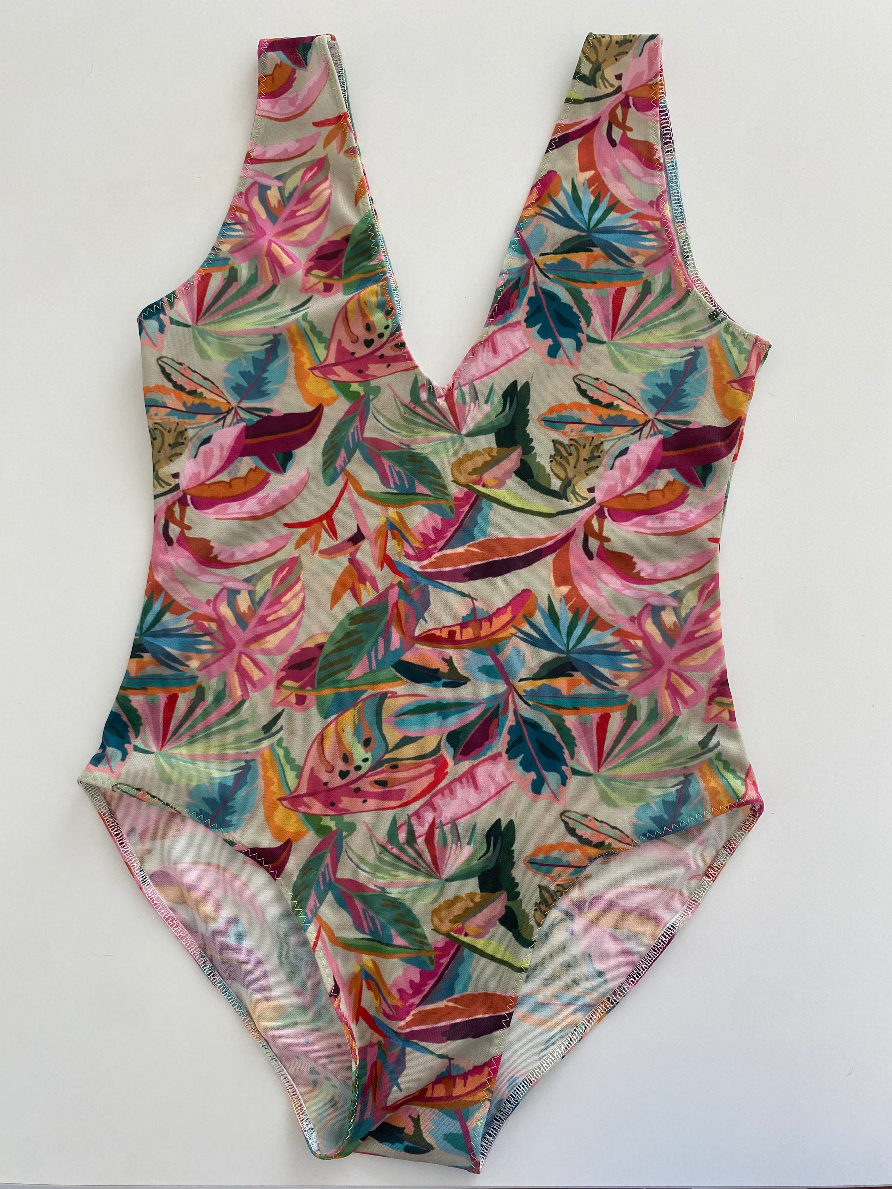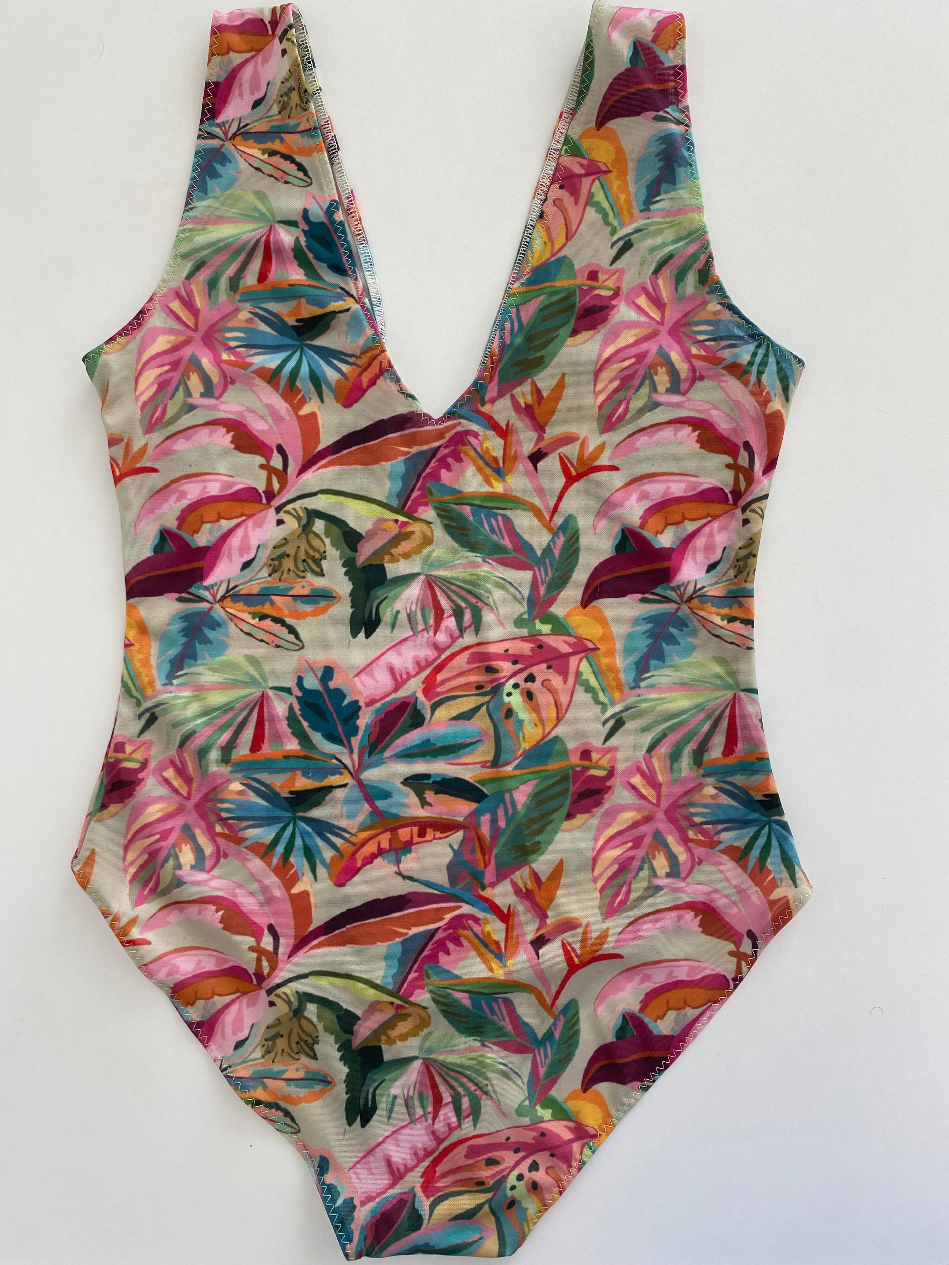 Maillot une pièce col V transbronzant en taille M coloris tropical.